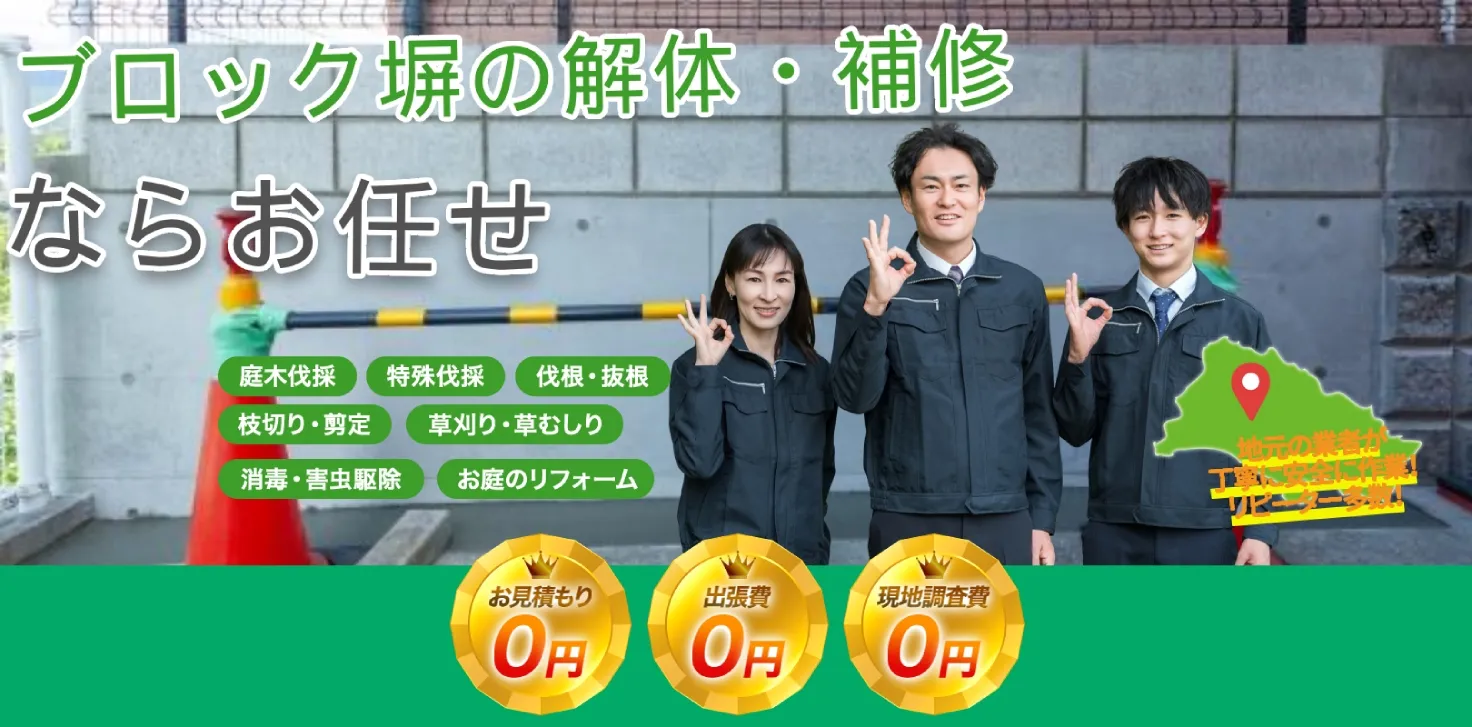 専門家がブロック塀の状態を正確に診断し、最適な解体・補修プランをご提案。地域密着の高品質施工を安心価格でご提供します。出張見積もりは無料です。まずはお気軽にご相談ください。