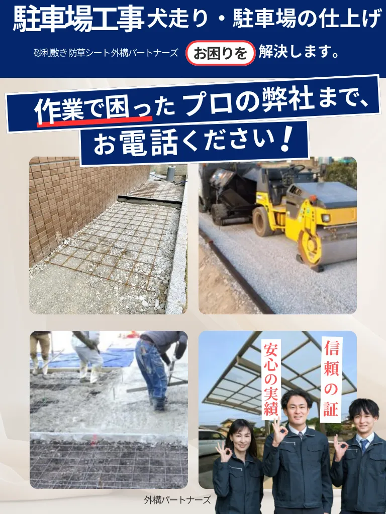 水はけ・耐久性・デザイン性を考慮した最適なプランをご提案。コンクリート、アスファルト、砂利、防草シート仕上げまで幅広く対応し、お客様の理想の住まいづくりをサポートします。出張見積もりは無料です。